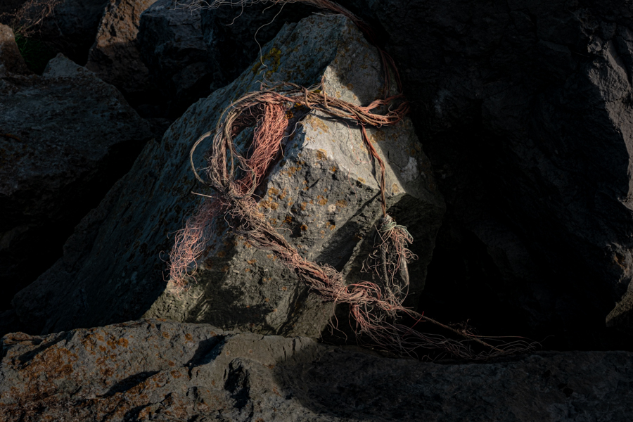 In this chapter,the image introduces an important thematic shift in the project:the move from photographing open landscapes and distant vessels to examining the intimate material residues left behind by the sea.The frayed pink net, woven into the fractures of the rock becomes a symbolic node through which multiple maritime histories can be read simultaneously.